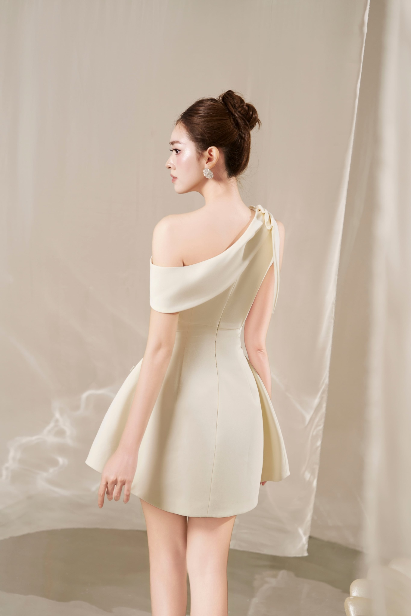 Váy đầm lệch vai dự tiệc thiết kế vạt nơ dáng ngắn form đẹp sang chảnh